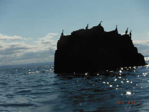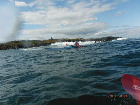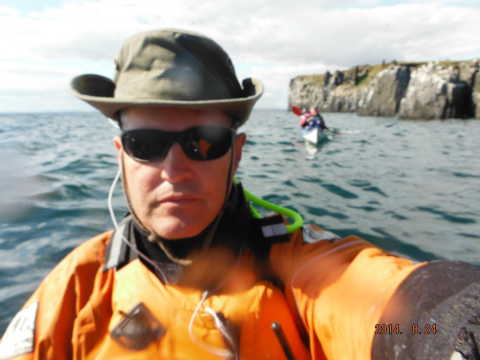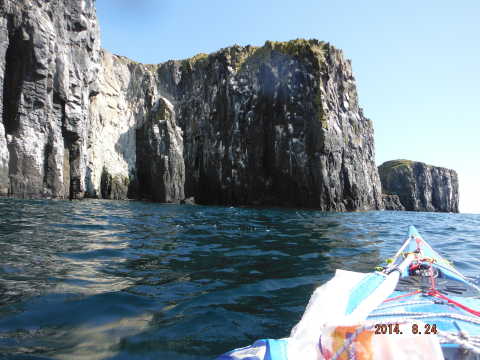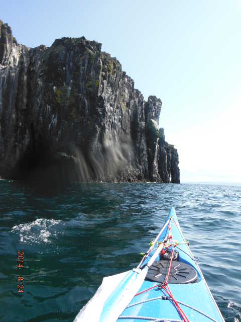 Once we reached Creel the wind dropped and even though we were further away from out intended paddle we decide Isle of May it was! With a reasonable size swell and the sun at our backs we were looking up at the tall cliffs at Alterstanes watching the waves crashing of the rocks with quite a force, we paddled in and around the caves and stacks which are spectacular for such a small island. The name of the island comes from old Norse meaning Island of seagulls to which there is plenty ( where a hat and don’t look up!) Other species on the Island are 14 diferant kinds of seagulls,puffins,black legged kittiwakes, guillemots,shags,razorbills,fullmers,oystercatchers, elderduck,tern and gull. We headed around to the lighthouse to go for a well needed lunch only to meet by more crashing waves stopping up from landing so headed back to a more sheltered rocky bay only to be met by the Scottish Natural Heritage guy who surprisingly gave us a hand up the rocks with our kayaks 🙂 telling us to watch out for the camera’s if we needed to pee as they can zoom in quite a distance! (would need to eh Alf lol)