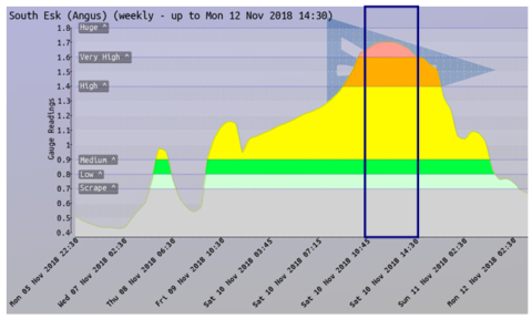 After some ins and outs the group ended up as 12 people, with a mix of river and sea participants. A game of paper-scissors-stone on Saturday morning gave Misha a sea day followed by a river day, whereas Graham had a river day then a sea day. Rain overnight had meant that a debate of West Water (Grade 3 / 4) or South Esk (Grade 2/3). The group (Graham, Derek, Gianni, Marcus and Sam) stopped for a look as we crossed the South Esk and it looked big and brown and seemed a good choice. The gauge when we got a phone signal in the morning was “Medium”. By the time we set off the water was lapping the car park, now somewhere between “very high” and “huge” (See the peak of the pink chart below). Although in the guidebook as grade 2/3 the river was going like an express train and Sam after some early warm up ferry glides decided it wasn’t for him that day.