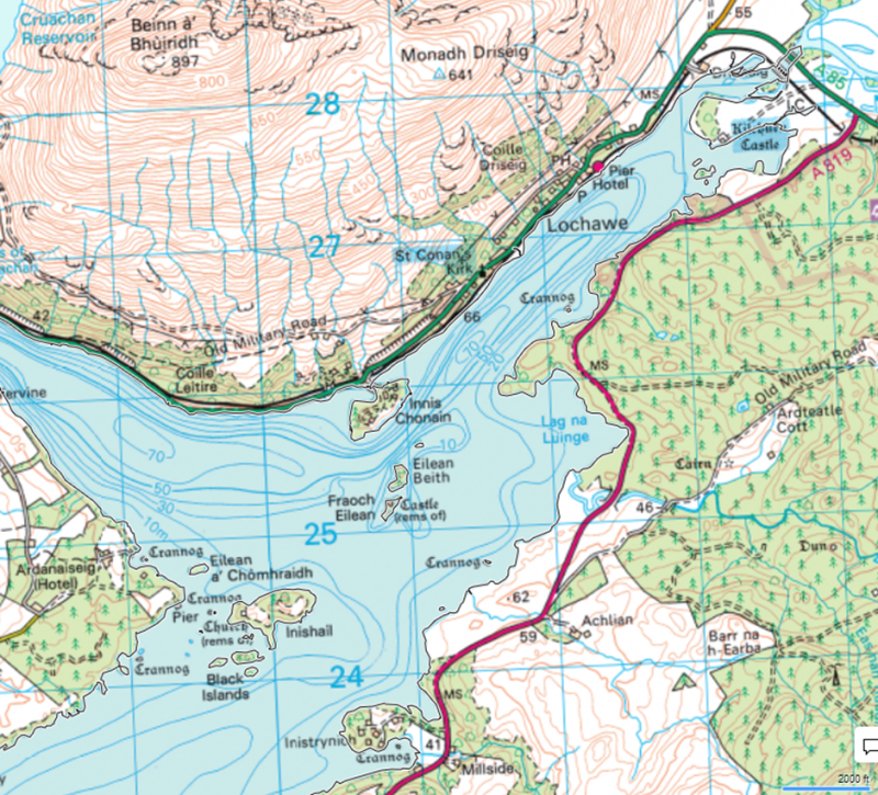 - Fraoch Eilean (NN109:252) – ruined 13th century castle showing hall and courtyard